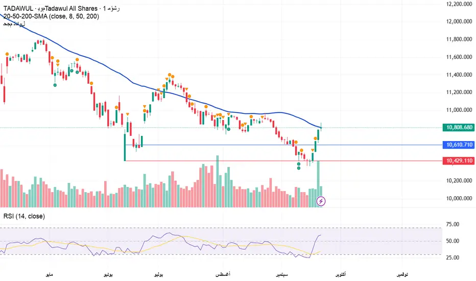 على فاصل اليوم فالمؤشر بعد أن صعد بشكل متتالي على مدى 4 أيام فإنه واجه اليوم مقاومة تتمثل في متوسط 50 يوم، ومن المرجح أن يكون عندها بعضاً من جني الربح، خصوصاً مع تكون شمعة دوجي بنهاية تدوالات اليوم، وبالتالي يكون هناك بعض النزول، وخصوصاً في الأسهم المؤثرة على المؤشر والتي صعدت بالتوازي معه في الأيام الماضية، ولكن بشكل عام فما دام المؤشر لم يكسر في تصحيحه القادم الدعم المتمثل باللون الأزرق فإن احتمالية مواصلة الارتداد قائمة، ومع كسرها بإغلاق فالأقرب أن السلبية عادت.