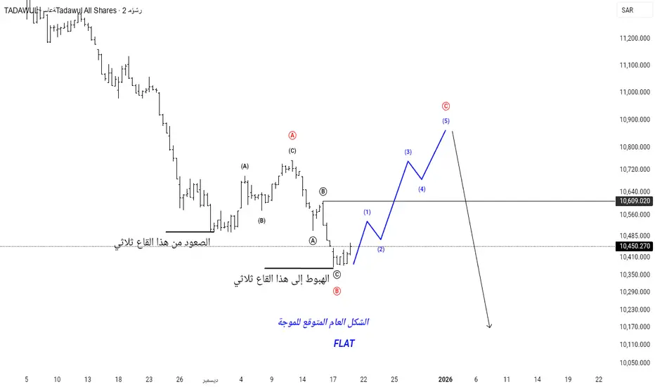 مؤشر السوق السعودي تاسي ونموذج فلات مُحتمل على فاصل الساعتين ، ف اللي نحتاجه من تاسي الحفاظ على الهبوط الحالي بشكله الثلاثي ، ثم إختراق مستويات 10609 للصعود في موجة c بين 10800 , 10950 ثم إكمال المسار الهابط .