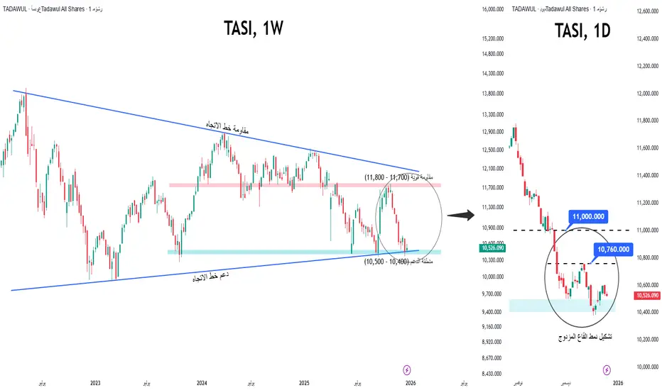 ● مقاومة رئيسية: 11,000 (اختراق حاسم فوق هذا المستوى يؤكد الانعكاس)