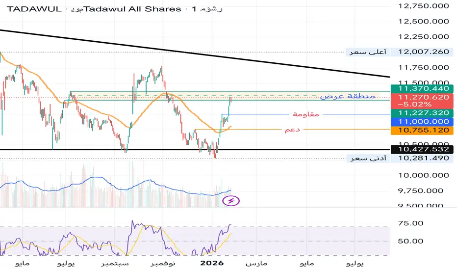 على فاصل اليوم فإن المؤشر العام قد بلغ مناطق العرض التي تم تحديدها سابقا، وظهرت لدينا في هذه المنطقة شمعة هامر سلبية، وهذا سلوك سلبي لو أضفنا إليه بلوغ مؤشر الار إس أي مناطق التشبع البيعي وأضفنا إليه أيضاً ارتفاع حجم التداول باللون الأحمر، فإننا نبدأ نترقب نزولًا محتملًا بشكل كبير، والذي سيكون نزولًا تصحيحيًا بوصول العديد من الأسهم إلى مناطق جني أرباح محتملة.لذلك، التخفيف في هذه المناطق أمر جيد.