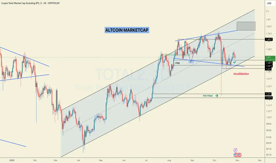 Altcoin Market Cap: The recent crash has filled the daily FVG. The $2T level remains the target, with invalidation below $1.43T.