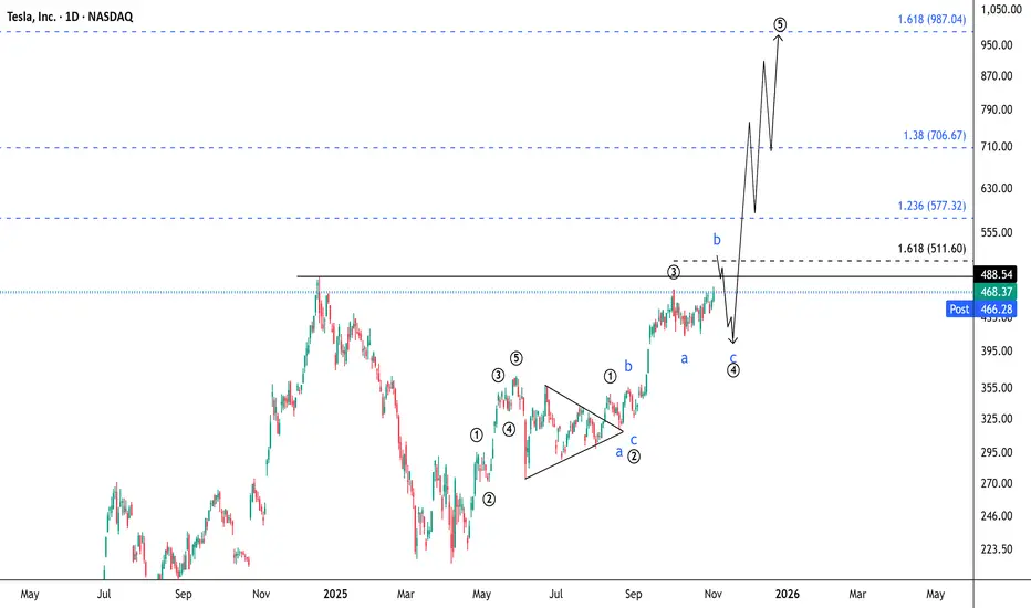 Currently, Tesla is correcting in a wave (4), which is expected to end around the $(390-430) area.