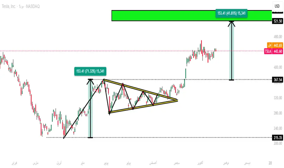 يتّضح أن المثلث عمل كمنطقة تجميع قوية بعد الصعود من 225 إلى حدود 385 دولار، قبل أن تنجح تسلا باختراقه للأعلى، مؤكّدةً استمرار الاتجاه الرئيسي.