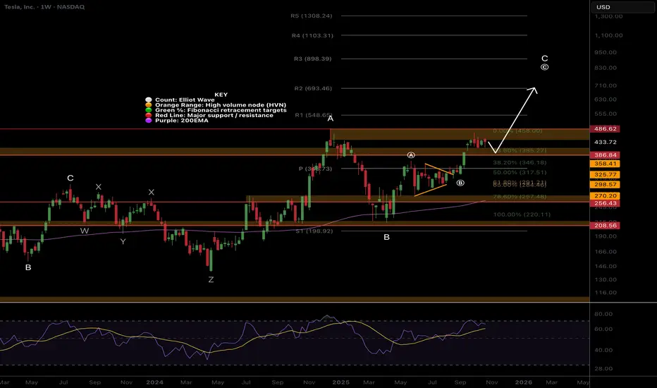 Wave © of C appears to be underway into price discovery with a target of $693 the R2 weekly pivot. This is because it has been printing a series of 3 wave structures. Wave B printed a triangle which is a pattern found before a terminal move reinforcing the Elliot wave count.