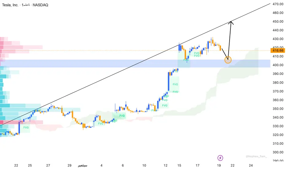 سجل سهم تسلا 416.66 دولار بانخفاض قدره 5.78 دولار (1.37٪) بعد اقتراب السعر من مستوى 430 دولار، مما دفع المستثمرين إلى جني الأرباح. التحركات السابقة تركت فجوات سعرية (FVG) يمكن أن تشكل مناطق دعم إذا عاد السعر لاختبارها. أحجام التداول ارتفعت في الجلسات الأخيرة، ما يعكس دخول سيولة قوية ومشاركة لافتة من المستثمرين الكبار.