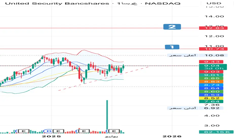 سهم UBFO يتحرك في ترند صاعد قصير المدى ويدعم الصعود بقاء السعر فوق 9.01. المقاومة الحالية 9.43، واختراقها بإغلاق ساعة مع حجم تداول قوي يفتح الطريق نحو 10.08 ثم 10.73. أما كسر 9.01 فقد يدفع السعر للهبوط نحو 8.52. الاتجاه إيجابي ما دام الترند الصاعد محافظ عليه