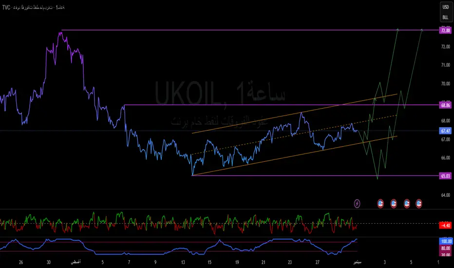 السعر الحالي يتداول عند 67.47 داخل قناة صاعدة واضحة (خطوط برتقالية).