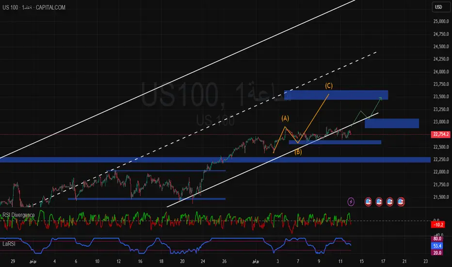 مؤشر US100 يتحرك داخل قناة صاعدة على المدى المتوسط، ويُظهر حالياً سلوكًا عرضيًا إيجابيًا، مع إشارات لبداية موجة دافعة (ABC) قيد التشكل، حيث انتهت الموجة التصحيحية B ويُنتظر انطلاق C الصاعدة باتجاه مناطق العرض القادمة.