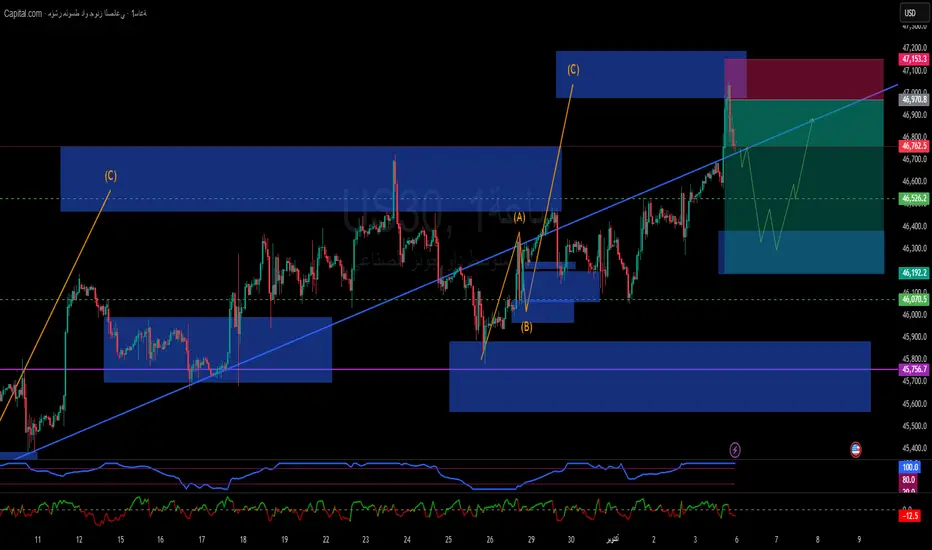 هبوط تصحيحي إلى 46,300 – 46,100 لجمع السيولة، ثم انطلاق موجة (C) صاعدة قد تصل إلى 47,150 – 47,700 كأهداف هيكلية.