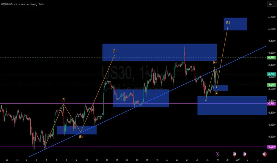 السيناريو الأقرب: صعود من المستويات الحالية باتجاه 46,520 – 46,800 كمنطقة (C) مستهدفة.