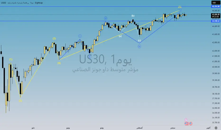 الموجة الخامسة لم تنتهِ بعد، وأقصى صعود محتمل عند 46,454.80، حيث تبلغ الموجة 5 61.8% من الموجة 1.