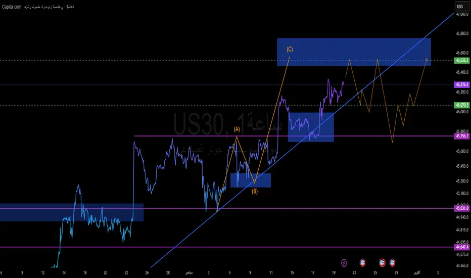 الداو جونز على الإطار H1 يكشف بوضوح أننا خرجنا من الموجة (A-B) ودخلنا في موجة (C) صاعدة دفعت المؤشر إلى مناطق 46,500، لكن ما بين هذه القمة المؤقتة وخط الاتجاه الأزرق، تتشكل ساحة اختبار صعبة لا ترحم المتأخرين.