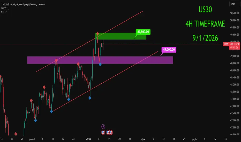 الداو جونز الذي يتداول في الإتجاه الصاعد على فرايم الأربع ساعات ويشكل القناة الصاعدة باللون الأحمر، إخترق مؤخرا منطقة المقاومة 49000 للأعلى وأعاد إختبارها وصعد منها بعد أن تحولت الى منطقة دعم وشكل قمة جديدة ومنطقة مقاومة جديدة حول أسعار 49500 التي إذا إخترقها السعر للأعلى سيشكلل موجة صاعدة قوية جديدة.