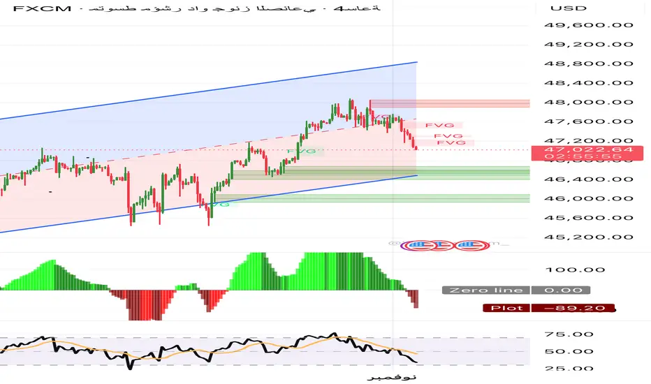 • المؤشر يقترب من الحد السفلي للقناة الصاعدة عند 46,400 – 46,500، وهي منطقة دعم فني محورية.