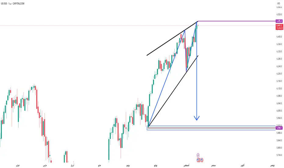 يتواجد مؤشر S&P 500 (SPX) حالياً عند قمة نموذج وتد صاعد على فريم اليومي، وهو من النماذج الانعكاسية التي عادة ما تسبق حركات تصحيحية قوية إذا فشل السعر في الاختراق. المستوى المحوري الآن هو 6485، وهو سقف الوتد وأعلى قمة تاريخية حالية.