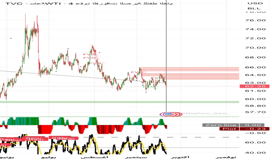• مناطق FVG (فجوات سعرية) لم تُغلق بعد عند 63.50 – 64.50 مما قد يشكل أهداف لأي ارتداد صاعد.
