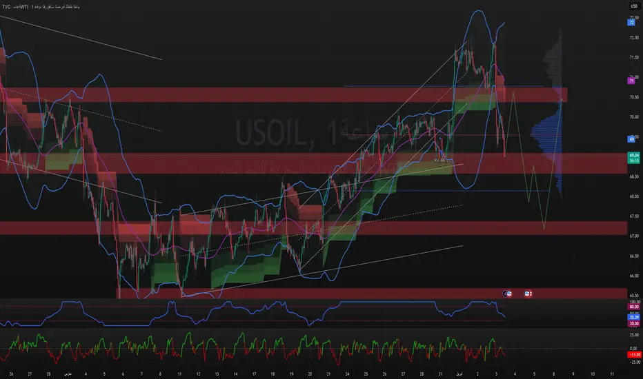 النفط كسر القناة الصاعدة، وهبط بسرعة من قمة 72.00 ليصل إلى دعم سيادي عند المنطقة 68.50 – 69.00
