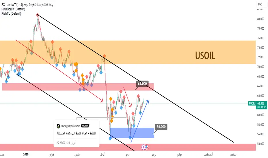 بعد توقع الموجة الهابطة من من منطقة 65.00 باللون الأحمر ذكرنا أن الموجة الهابطة سوف تستمر الى المنطقة الشرائية 56.00 المحددة باللون الأزرق ومن هذه المنطقة نتوقع الإرتداد الصعودي، وهذه الذي حصل بالتحديد بعد ملامسة السعر منطقة 56.00 دولار بدأ السعر بالإرتداد صعودا مشكلا موجة مميزة حتى الأسعار الحالية والتي ينوقع أن تستمر الى منطقة تقاطع الترند الهابط للقناة مع منطقة 65.00 باللون الأحمر.