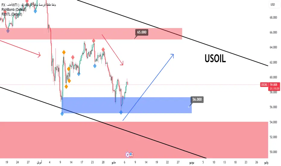 🍁النفط عند وصوله للمنطقة المحددة باللون الأزرق عند أسعار 56.00 دولار للبرميل صعد مباشرة بأكثر من 450 نقطة كما متوقع في التحليل الأخير للنفط.