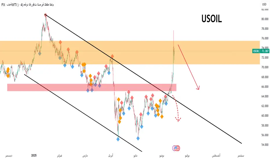 بعد أن كنا ننتظر الإرتداد الهبوطي من منطقة المقاومة باللون الأحمر المحددة في التحليل الأخير، إخترق السعر هذه المنطقة صعودا بقوة مدعوما بالأخبار السياسية والحرب القائمة في الشرق الاوسط لأن النفط يستفيد من التوترات والحروب لذا شهدنا موجة صاعدة كبيرة الى أسعار 78.00 دولار والآن يرتكز عند 73.00 وهذه منطقة مقاومة يمكن أن يرتد منها السعر هبوطا إذا تم الثبات تحتها في ظل التوترات القائمة.