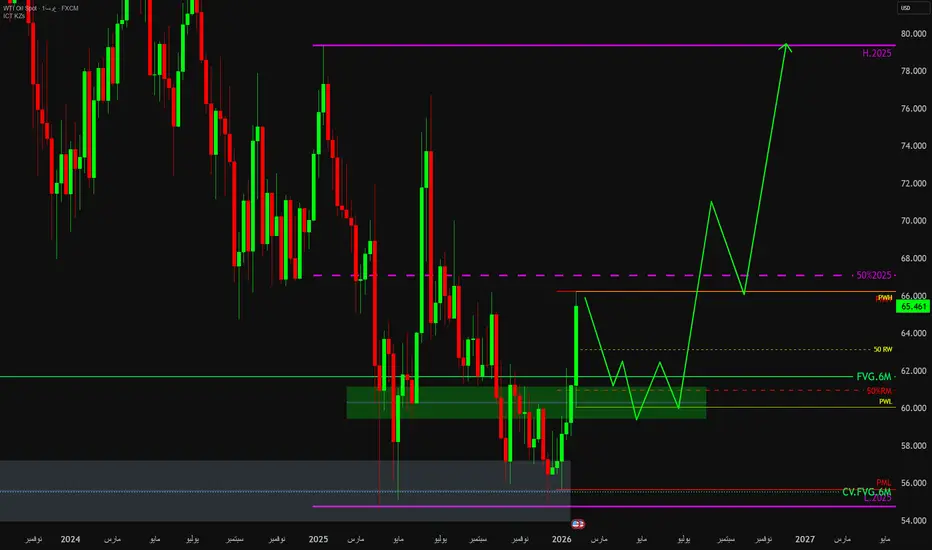 حالياً، من المتوقع حصول تصحيح سعري يعيد النفط إلى مناطق ارتكاز مناسبة للشراء قرب 60 دولار. هذه المنطقة تتوافق مع مناطق ديسكاونت، ومع منتصف الشهر الاندفاعي السابق، إضافةً إلى احتمالية إعادة اختبار قاع الأسبوع الماضي.