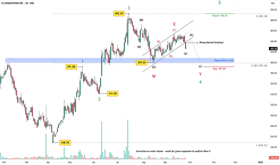 The stock completed a wave 3 advance up to 492.30. What followed is a corrective W–X–Y structure, which probably might test the previous breakout zone around 408–400. This aligns with the 0.382 Fibonacci retracement and previous Wave 1 high, providing strong support.