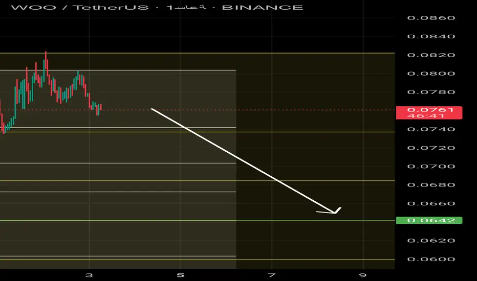 السلام عليكم ، بعد صعود مهم للعملة الرقمية WOOUSDT ووفق أرتدادات مهمة نتوقع تصحيح اله ثقل وهبوط وهدفنا هو 0.064