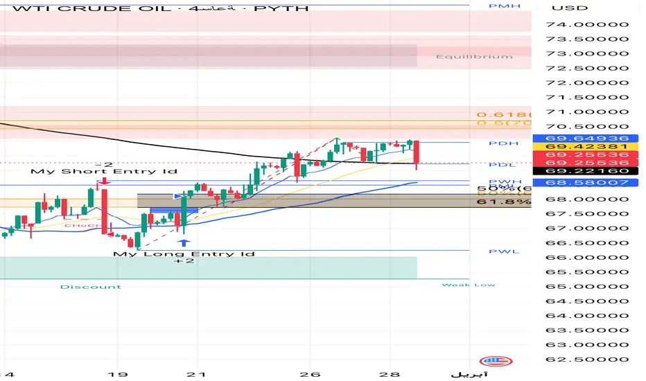 • يتواجد السعر حاليًا في منطقة ضغط قرب PDH حول 69.25$ – 69.50$.