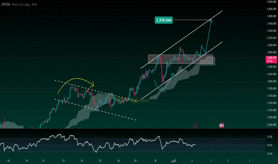 يُظهر مؤشر إيشيموكو أن السعر فوق مستوى السحابة، بينما استعاد مؤشر القوة النسبية توازنه بعد التعديل، مما يفتح مجالًا جديدًا للنمو. الهدف التالي محدد حول 3,970، وهو ما يتوافق مع خط القناة العلوي.