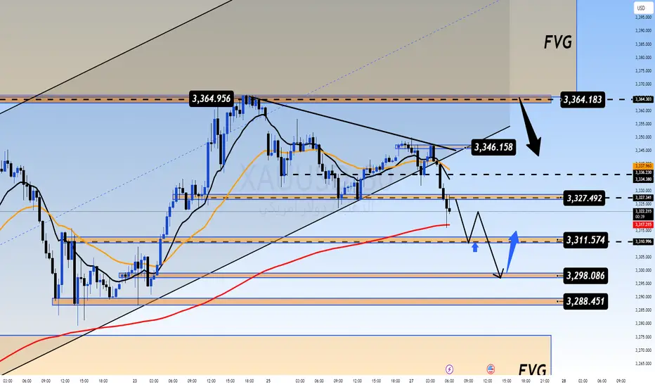 يُظهر الرسم البياني الفني للذهب (XAU/USD) على الإطار الزمني H1 ضغطاً واضحاً بعد رفض قوي من مستوى 3364. السعر الآن يتحرك ضمن قناة جانبية ضيقة مع دعم واضح عند 3311 ومقاومة قوية عند 3366.