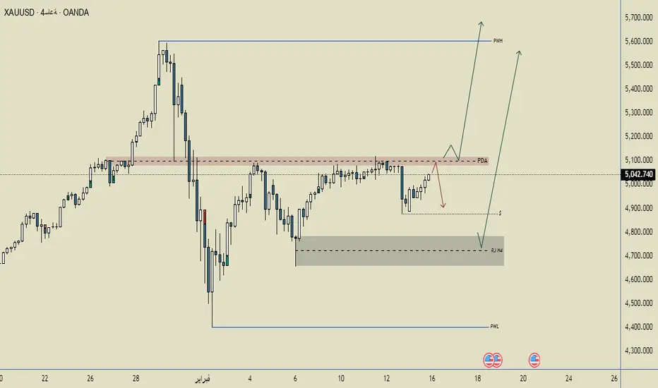 واضح إن السعر:صعد بقوة دخل منطقة عرض كوّن نوع من التماسك ممكن نشوف:صعود بسيط لاختبار 5070–5100 ثم هبوط تصحيحي إلى منطقة RJ4H بعدها انطلاقة صعود باتجاه: 5200 ثم 5500+ وربما إعادة اختبار القمة السابقة