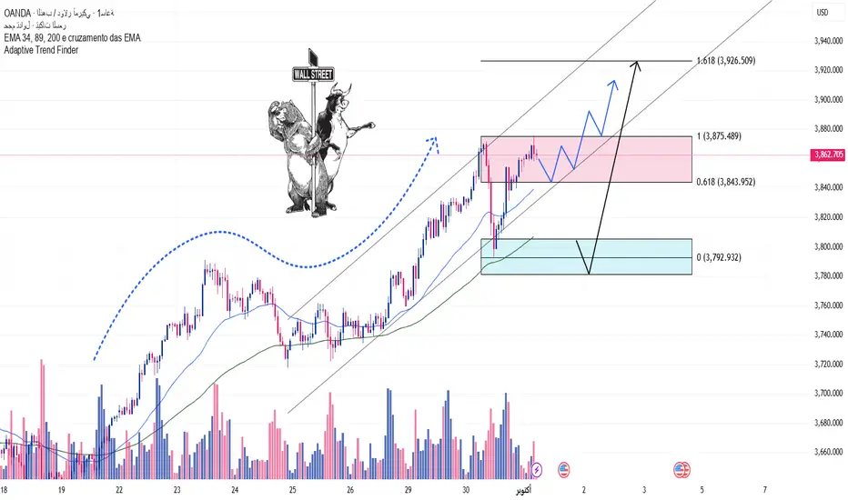 السيناريو الرئيسي: ثبات فوق 3,843 دولارًا ← ارتفاع نحو 3,926 دولارًا.