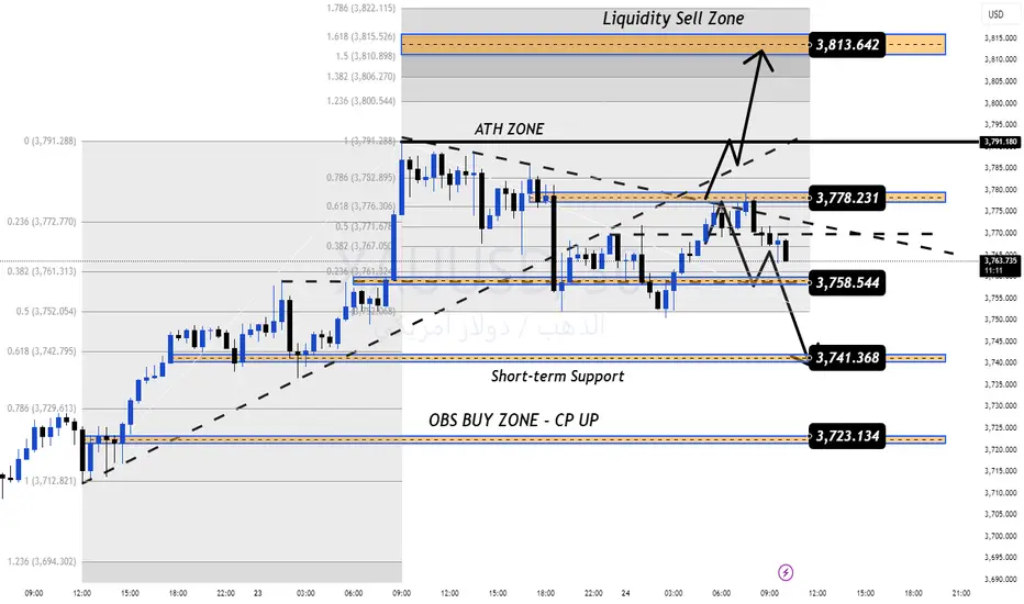 تقع المقاومة الرئيسية قصيرة الأجل حول 3778، مع أهداف سيولة ممتدة نحو 3813–3815.