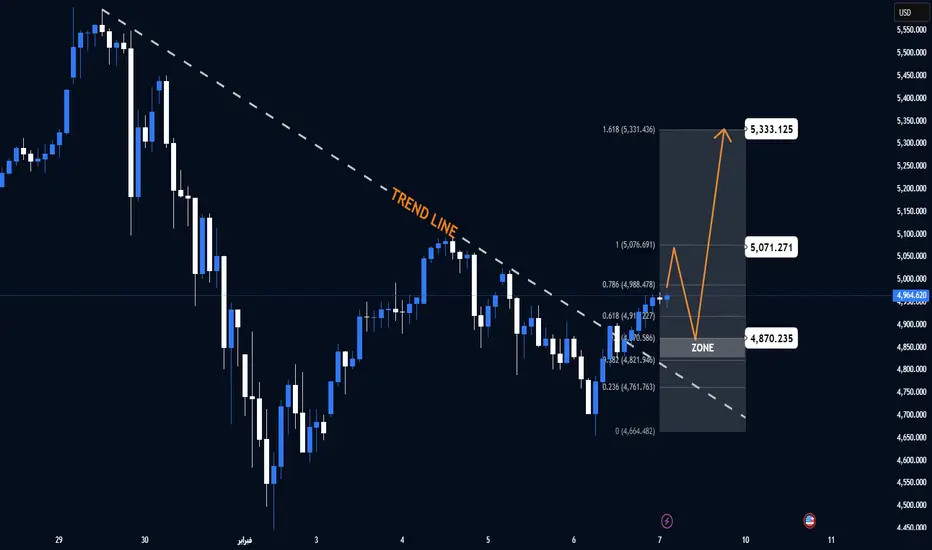 (دعم خط الاتجاه + فيب 0.618–0.786 + منطقة رد الفعل السابقة)