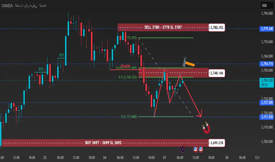 • 🟢 منطقة شراء 3,697–3,699 (SL 3,692): طلب خصم يتماشى مع مغناطيسات السيولة، مع أهداف صعودية عند 3,715 → 3,730 → 3,745+.