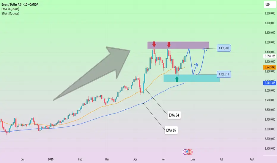 Emas perlahan-lahan mulai “mendaki” kembali menuju area puncak lama di 3.436 – sebuah “gerbang” yang sebelumnya sulit ditembus. Tren utama masih tetap naik, namun saat harga mendekati zona resistance ini, pasar cenderung menunjukkan gejolak.