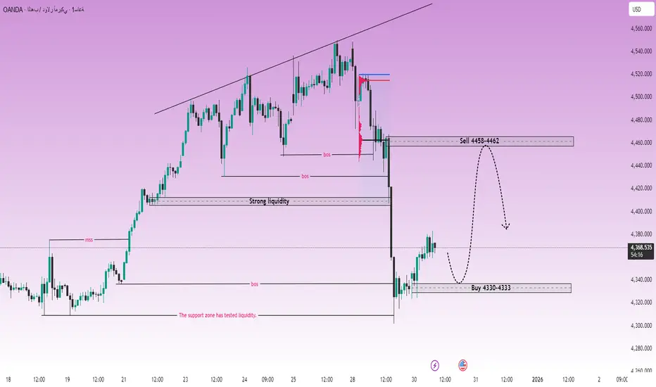 إذا وصل السعر إلى 4458–4462 وفشل في استعادة المنطقة فوق → يبقى الميل للبيع قويًا.