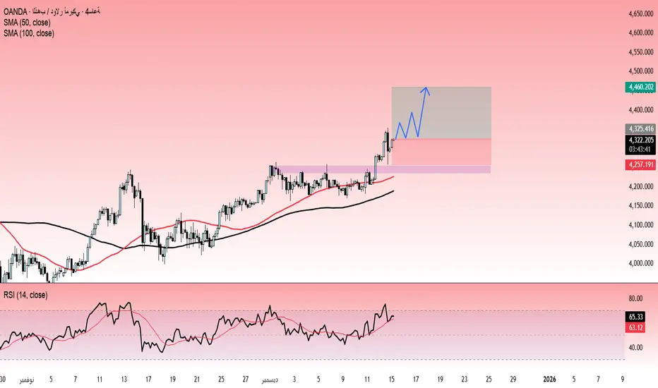 السيناريو الأكثر منطقية في الوقت الحالي هو استمرار تصحيح محدود يتبعه تماسك، ثم استئناف الحركة الصاعدة. وفي حال صمود منطقة الدعم الحالية، فإن XAUUSD يمتلك القدرة على التوجه نحو نطاق 4.40x – 4.46x خلال الجلسات القادمة، بما يتماشى مع منطق قمم أعلى وقيعان أعلى الذي يميز الاتجاه الصاعد.