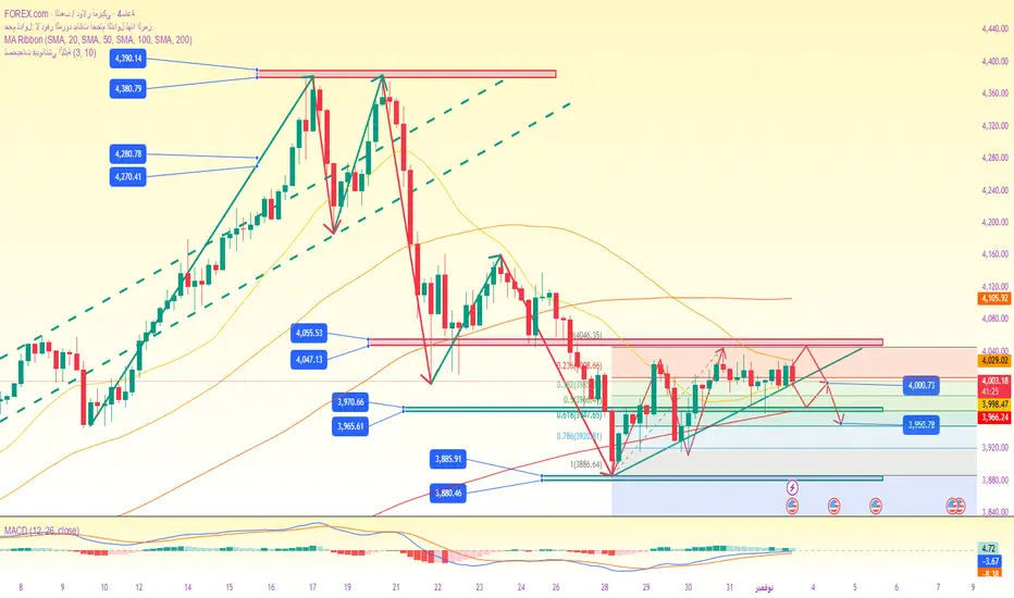 الأهداف: نستهدف منطقة 3990-3960؛ في حال اختراقها، من المحتمل استمرار الانخفاض نحو مستوى 3915.