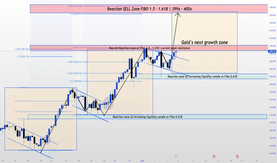 المرحلة الحالية تمتد نحو منطقة الإسقاط 1.5 – 1.618 (3995 دولار – 4003 دولار)، وهي تاريخيًا جيب انعكاس عالي الاحتمالية.