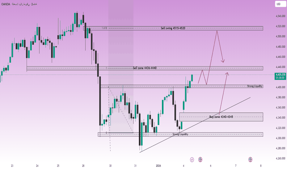 • OB صاعد + Fibo 0.5–0.618: 4,416 – 4,397
