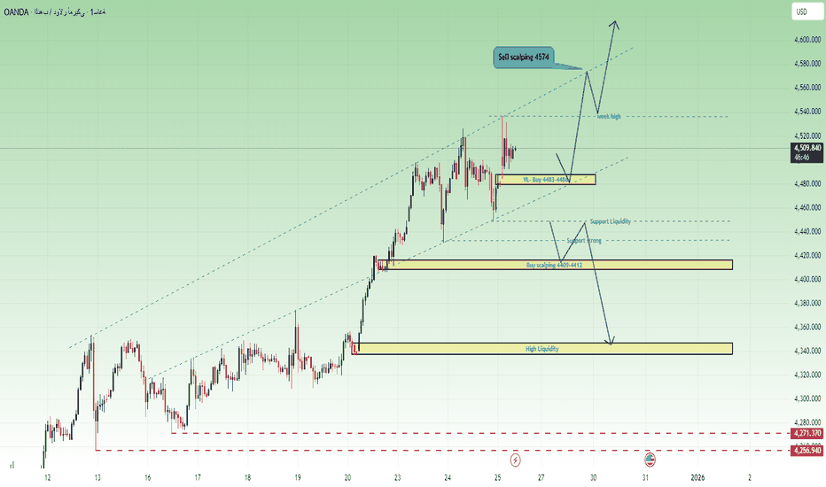 فكرة: هذه منطقة سيولة نظيفة داخل القناة الصاعدة. إذا لمس السعر 4483–4486 وظهر دعم قوي على H1، أفضل الشراء مع جني الأرباح المراحل إلى السيولة العليا.