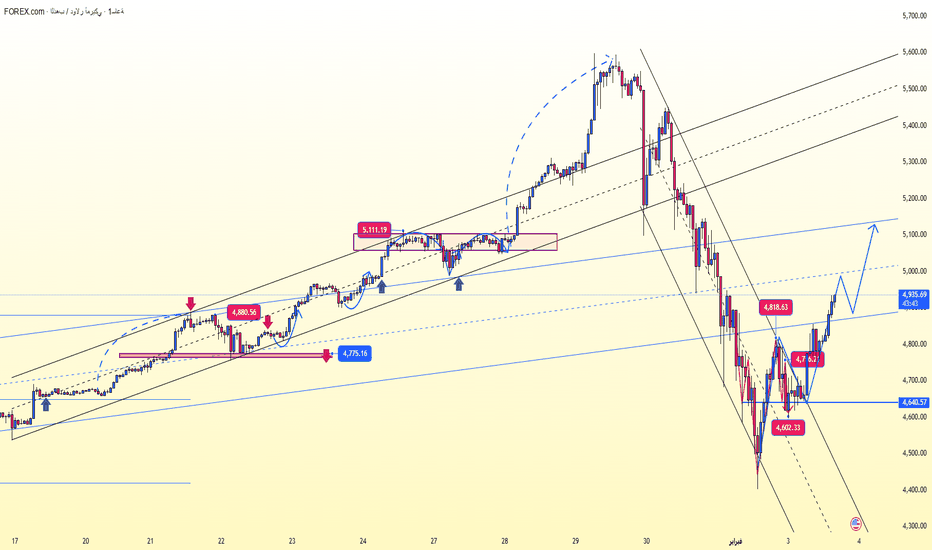 بمجرد امتصاص ضغط البيع، قد يبدأ السعر في التعافي التدريجي، مستهدفًا منطقة 4,850–4,900 أولاً. القبول فوق هذا المستوى سيفتح الباب أمام مناطق مقاومة أعلى.