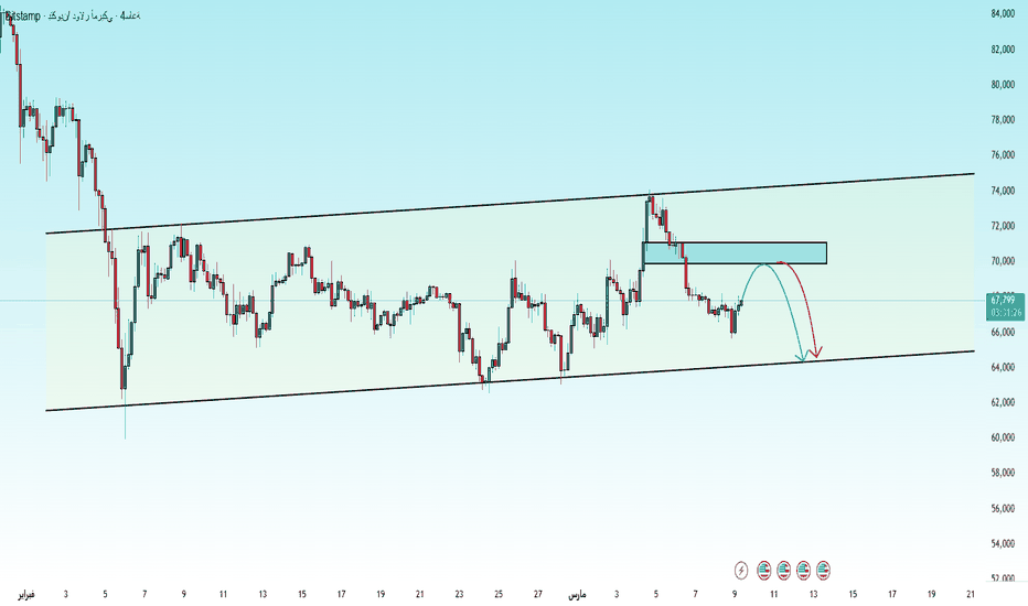 بيتكوين H4 قد يعيد اختبار دعم 65000 بعد قمة 74000بعد وصول البيتكوين إلى منطقة 73 إلى 74 ألف دولار، بدأ الهيكل السعري يُظهر إشارات تباطؤ واضحة. القمم الأخيرة أصبحت أقل ارتفاعاً، كما أن محاولات الارتداد لا تستمر طويلاً بسبب ظهور عروض بيع جديدة.