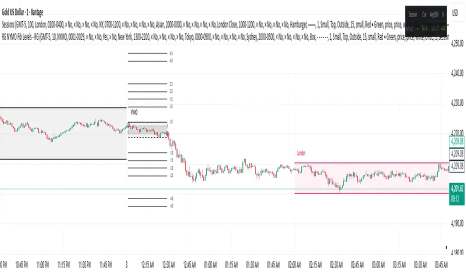On top of the fib framework, NYMO can show the NYMO session box, compare the current range to recent NYMO statistics, and trigger alerts when price breaks the NYMO high or low or trades through key fib areas. It is built for traders who only care about the New York morning and want all of their structure, targets and alerts driven by fibs from that one defined opening window.