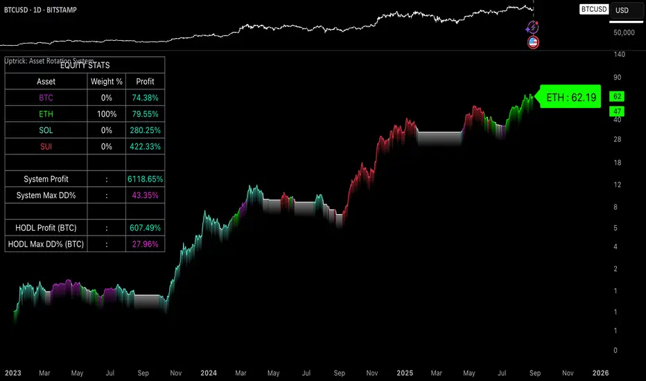 The Uptrick: Asset Rotation System is a high-level performance-based crypto rotation tool. It evaluates the normalized strength of selected assets and dynamically simulates capital rotation into the strongest asset while optionally sidestepping into cash when performance drops. Built to deliver an intelligent, low-noise view of where capital should move, this system is ideal for traders focused on strength-driven allocation without relying on standard technical indicators.