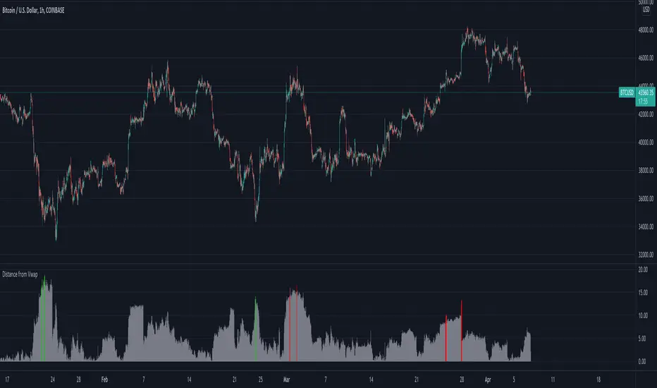 If the distance from the vwap stretches above that threshold, the histogram will go green if price is above VWAP and red if its below the vwap