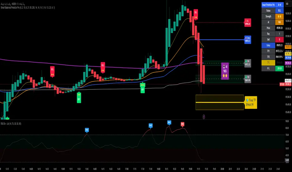 A smart, ensemble-style indicator that blends trend, momentum, volume, volatility, and candle patterns into a score & star system that produces Buy/Sell signals confirmed by MACD crosses. After a signal, it projects smart targets (TP1/TP2/TP3) and a stop-loss derived from ATR, with forward drawings and a control panel for trade management.