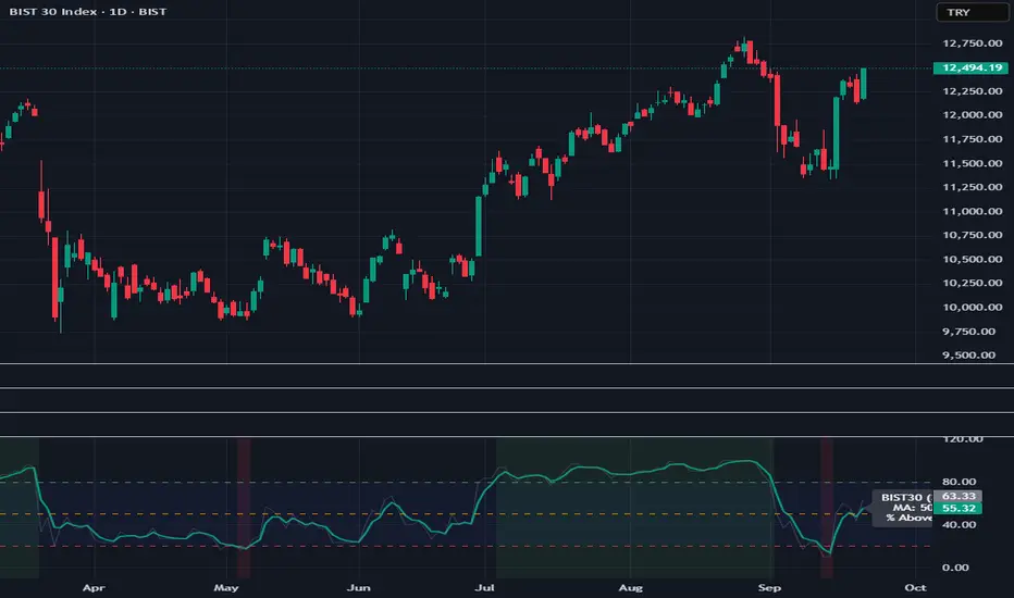 This indicator shows the percentage of BIST30 stocks trading above a selected moving average.