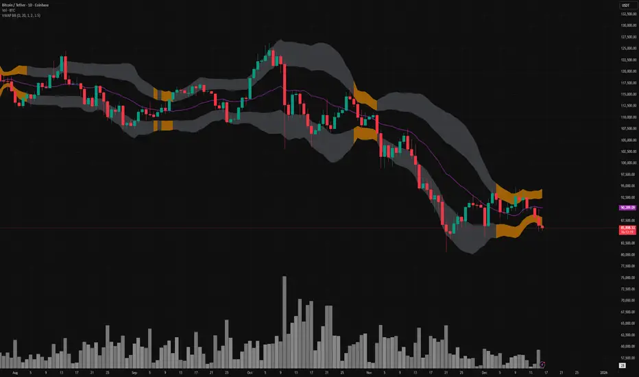 * **橙色区域 (挤压) = 平衡 (Balance):** 当布林带收缩(并变橙色)时,市场处于均衡状态。这是筹码密集的高成交量区。**注意:** 历史上的橙色区域在未来回踩时往往起到强力的 支撑/阻力 作用。